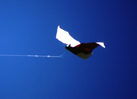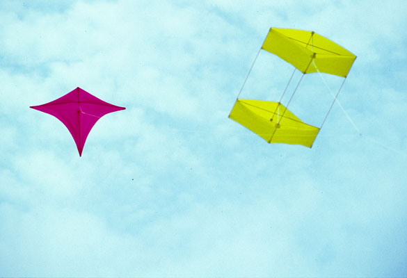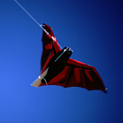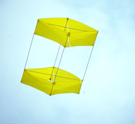 Kites are truly remarkable - toys that require a thorough understanding of aerodynamics to create. Kites have been around for a long time and come in many different forms and shapes, made from many different kinds of material. Some amazing kites have been made with the most basic of material by master craftsman, mostly in southeast Asia. Today we also make kites from high tech fibers, using modern design tools. What all kites have in common is the fun that it is to fly a kite. Of course, some if this fun is very, very serious. I have made a few kites and enjoy flying them, often at the beach. Here you can find some pictures of these kites and some details on their construction. Bat-kiteThis bat kite was made from a kit. My friend Taylor and I made it together. Two kites on one flying lineYellow Box Kite